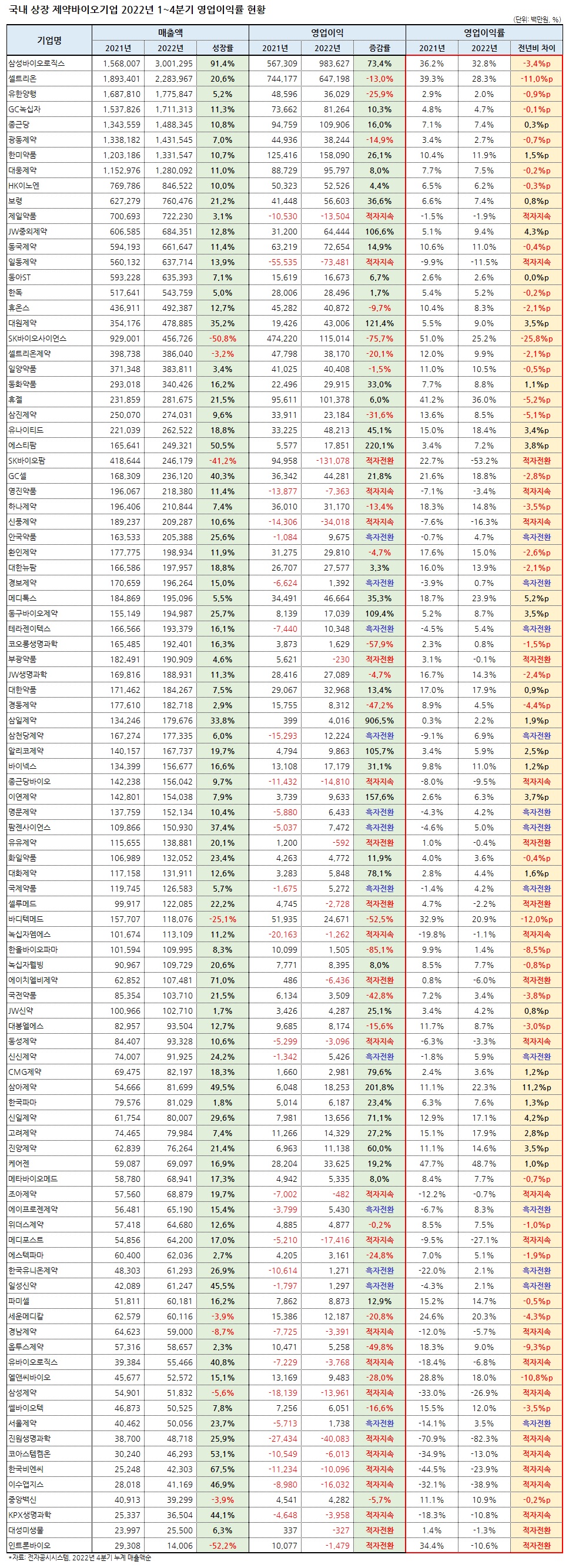 특히, 인트론바이오, SK바이오팜, 경남제약, 삼성제약 등은 매출 역성장에 영업이익 적자를 기록하며 '경고등'이 켜졌고 SK바이오사이언스, 바디텍메드, 중앙백신, 세운메디칼, 셀트리온제약 등은 영업이익은 흑자이지만 영업이익률 감소와 마이너스 성장이 겹치며 부진을 겪는 것으로 나타났다.