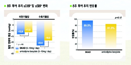 8주 투여 후의 이완기 혈압은 스카드정 투여군에서 12.8mmHg, amlodipine besylate 투여군에서 11.5mmHg가 감소했으며 수축기 혈압은 각각 22.6mmHg, 18.5mmHg가 감소해 스카드정이 amlodipine besylate에 대해 동등 이상의 혈압강하 효과를 발휘하는 것으로 확인했다.