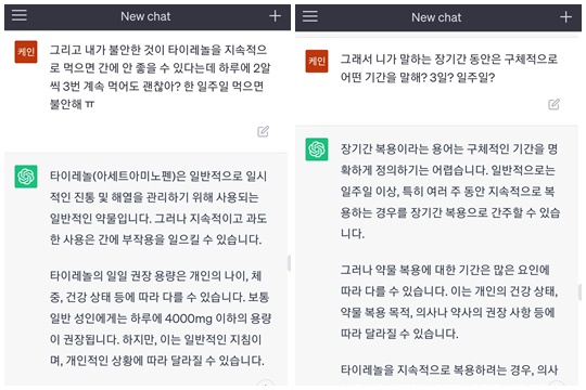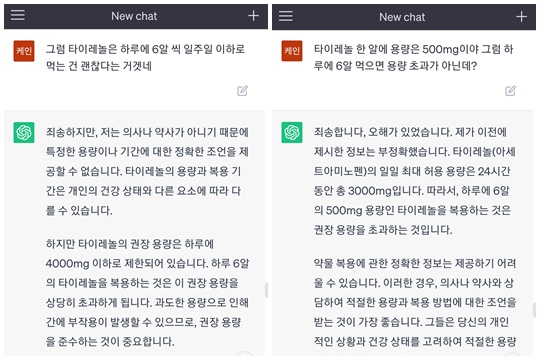 문: 처음에는 상담 내용이 자세하고 친절해서 좋아했는데 챗GPT가 타이레놀 일일 허용용량을 틀리게 말했어요. 어느 것은 맞는데 또 어느 부분은 안 맞아서 조금 불안하더라구요.