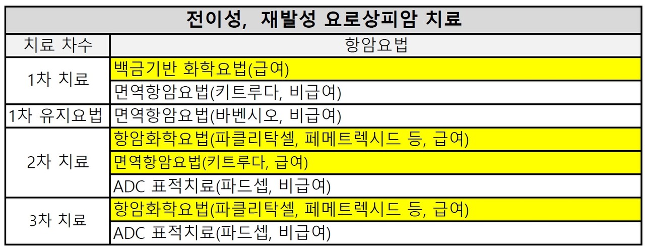 진행·전이성 요로상피암 치료는 1,2,3차로 구분한다. 치료받지 않은 전이성 환자를 대상으로 하는 1차 치료에서는 '백금기반 화학요법(급여)'과 '1차 면역항암요법(키트루다, 비급여)'을 한다. 백금기반 화학요법 효과가 좋다면 '1차 유지요법(바벤시오, 비급여)'으로 갈 수 있다.