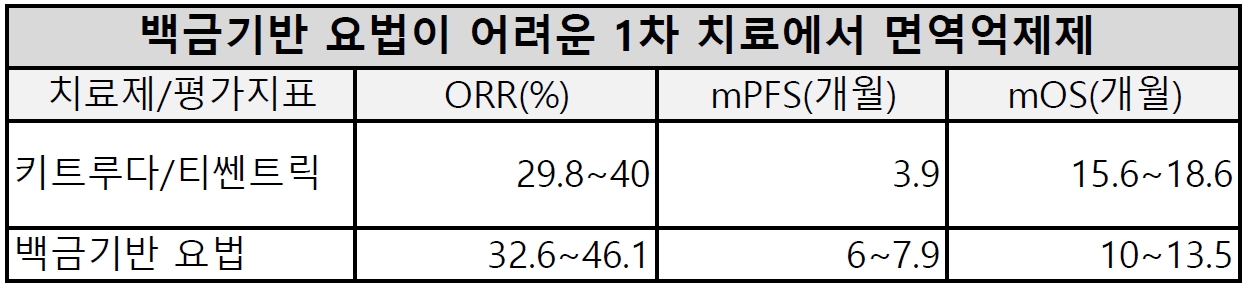 1차 치료에서 면역항암제 반응률은 29~40%이며 무진행생존기간 중앙값 3.9~6.4개월, 전체생존기간도 15.6개월~18.6개월로 백금기반 요법을 받을 수 없는 환자에서 고려 가능한 주요한 옵션이다. 그러나 비급여로 치료 접근성은 쉽지 않다.