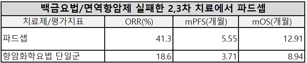 파드셉은 1년 이상 생존기간을 보이며 2,3차 치료에서 중요한 의미를 남겼다. 다만 언제 급여가 될지 알 수 없다.