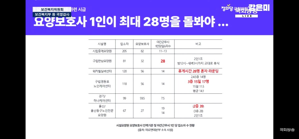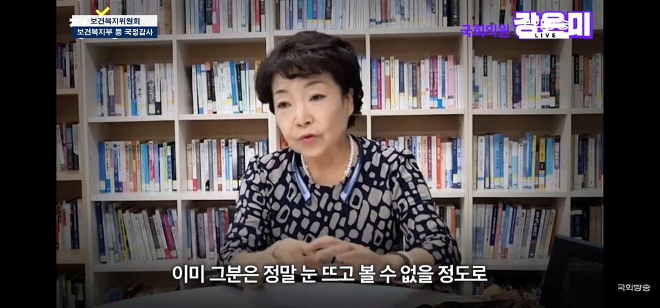 강은미: 관련 보고서가 계속 나오지만 현실은 그대로입니다. (울먹이며) 현행 제도상 노인들에게는 끔찍한 죽음을 마주하게 만들고 자식들은 불효자로, 요양보호사는 학대 가해자로 만드는데, 이대로 놓아 둘 수가 없습니다. 인력 기준부터 개선해주십시오.
