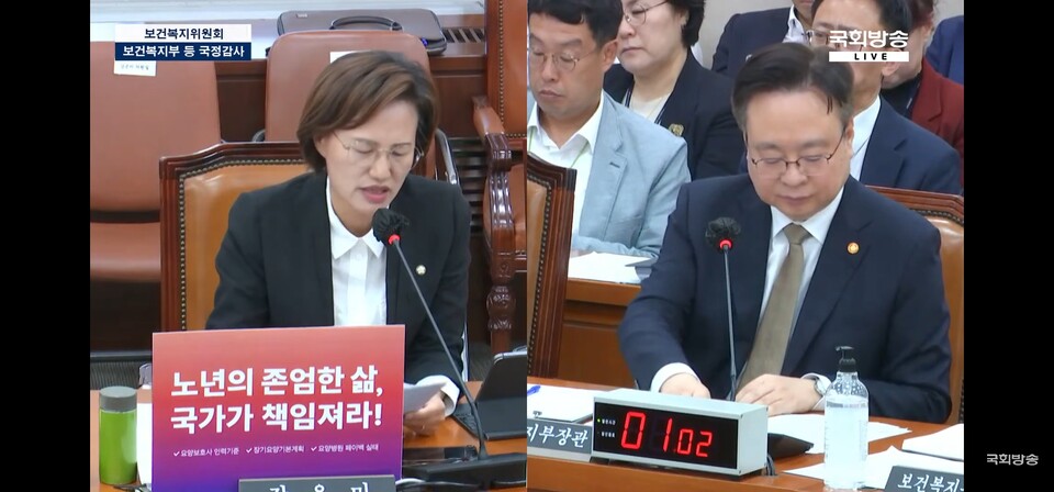 복지부 국감 첫날, 국회에서도 여야를 막론하고 같은 목소리가 들렸다. 특히 강은미 정의당 의원은 복지부가 수년간 방관한 노인 돌봄 시스템이 요양보호사를 '학대 가해자'로, 자식을 '불효자'로 만들어왔다고 주장했다.