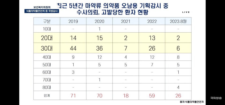 강 의원은 "심지어 마약류 의약품 오남용 기획 감시에 따라 수사 의뢰된 국민들은 2021년에 18명에서 1년 사이 59명으로 4배 늘었다"며 "그중 20~30대 국민이 3분의 1 수준이다. 지금 홍보에 집중하실 게 아니다"고 강조했다.