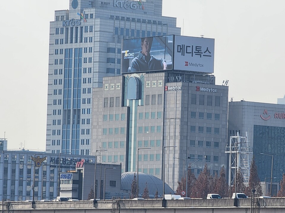 영상 광고판에서는 KFC, 자코모 등 유명 프랜차이즈 브랜드 영상 광고가 나왔다. 광고판 왼쪽에는 'Medytox'란 영문 글자가 보였다. 메디톡스가 건물 옥상에 설치한 영상 광고판이었다.