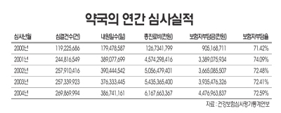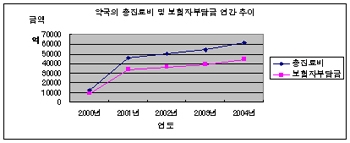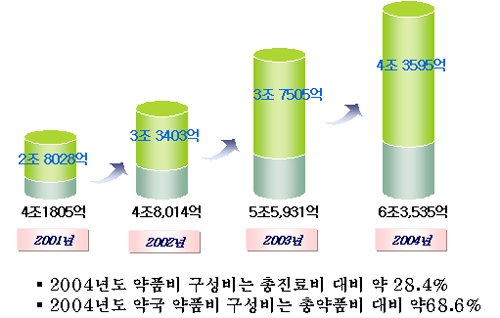 약국의 총진료비(보험자부담금)는 2001년에 2000년 대비 261% 증가하였고, 2002년부터는 매년 10.5%, 7.4%, 13.4% 정도로 증가 추세를 유지하고 있다.