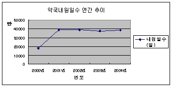 약국내원일수는 2001년에 2000년 대비 116% 증가하였고, 2002년부터는 증가분이 2% 내외로 미미하게 나타났다.