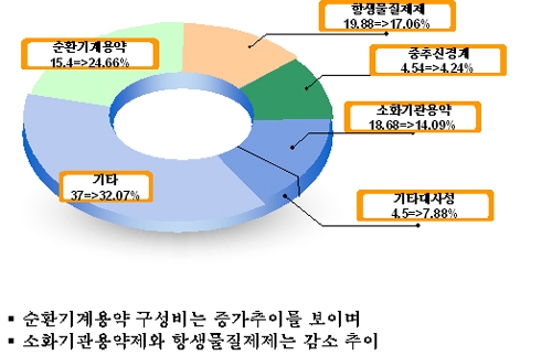 다만, 보건복지부의 건강보험재정안정추가대책(2001.10.5)에 따라 총 1,403품목에 해당하는 일반의약품이 단계별로 비급여 품목으로 전환됨에 따라 중분류 230(소화기관용약), 외피용약(260) 등에 해당하는 일부군에서는 10순위 품목군에 변동 요인으로 작용했을 것으로 추측된다.