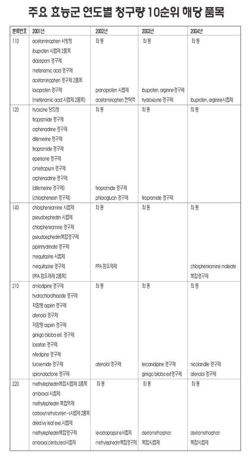 대부분 의약분업 이후 4년간의 품목 변동은 매년 2-3 품목 정도에 그쳤으며, 꾸준히 5-6품목은 10순위에 포함되고 있는 것으로 분석되었다.