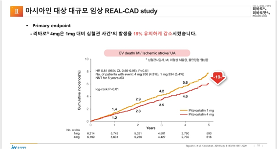 이에 반해 리바로의 경우는 아시아인을 대상으로 대규모로 진행된 REAL-CAD 연구를 통해 지질강하효과와 심혈관질환 예방효과를 입증하였다는 점에서 주목할 필요가 있다고 강조했다. 또한 REAL-CAD 연구에서 리바로는 저용량(1mg) 대비 고용량(4mg)의 이점을 분명히 보여주었다고 덧붙였다.