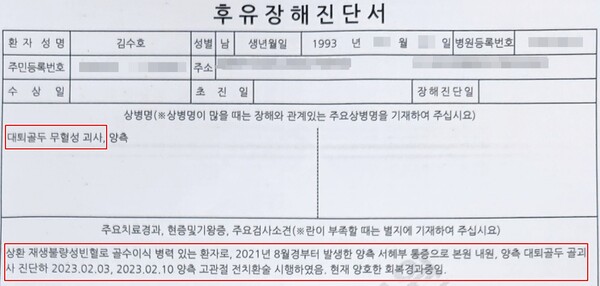 김 씨는 13일 "2022년 11월경, 화장실에서 볼 일을 보고 일어나지 못해서 응급실로 향했다"며 "MRI를 찍었는데 이미 괴사가 많이 진행된 상태여서 인공관절 말고는 다른 방법이 없다는 소견을 들었다. 수술 당시 수혈 이슈가 발생할 수 있어서 혈액종양내과 의료진이 함께 들어왔다"고 밝혔다.