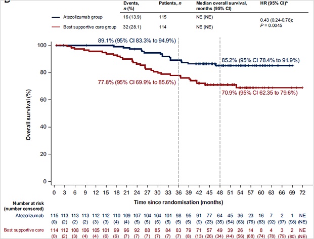 지난해 7월 티쎈트릭의 전체생존율 추가 데이터가 공개됐다. 3상인 IMpower010 연구 4년(중앙값 45.3개월) 추적 관찰 결과에서 PD-L1 발현율 50% 이상인 2~3A기 비소세포폐암 환자에게 티쎈트릭을 보조요법으로 사용 시 3년 시점 전체생존율(OS)이 89.1%를 기록했다. 이에 반해 최적지지요법군(BSC)은 77.8%를 기록해 11.3%p의 차이가 났다.