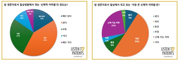 설문조사 결과를 살펴보면, 암 생존자로서 일상생활에서 겪는 ‘신체적 어려움(피로, 통증, 부종 등)’의 정도를 묻는 질문에는 △매우 많다(16%) △많다(42%) △보통(27%) △적다(10%) △매우 적다(5%)로, 응답자의 58%는 신체적 어려움을 ‘많이’ 경험하는 것으로 나타났다.