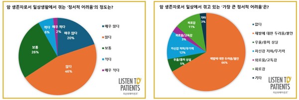 이어서 ‘정서적 어려움(우울, 무기력, 불면, 재발에 대한 두려움 등)’의 정도를 묻는 질문에는 △매우 많다(20%) △많다(46%) △보통(26%) △적다(6%) △매우 적다(2%)로, 응답자의 66%는 정서적 어려움을 ‘많이’ 경험하는 것으로 나타났다.