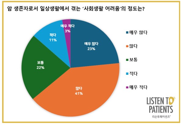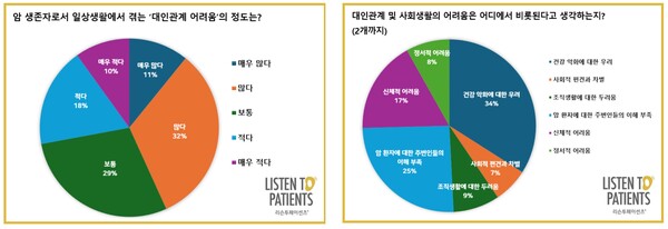 아울러, 리슨투페이션츠 명성옥 대표는 “국내 암 생존자 수가 200만 명을 넘어선 지 벌써 수년이 되었지만, 그들의 사회복귀는 여러 면에서 어려움이 많은 게 사실이다. 이번 리슨투페이션츠의 설문조사는 2019년부터 국립암센터 등에서 지정한 암생존자 주간(6월 첫째 주)을 맞이해 진행하게 되었고, 암 생존자 분들이 사회에 복귀하는 데 신체적, 정서적, 대인관계 및 사회생활의 어려움이 무엇인지 들어보게 되었다”라며, “앞으로도 리슨투페이션츠는 암 및 중증질환 환자 중심의 목소리를 모아 전함으로써 우리 사회가 더 깊은 통찰력을 얻을 수 있도록 노력하겠다”라고 말했다.