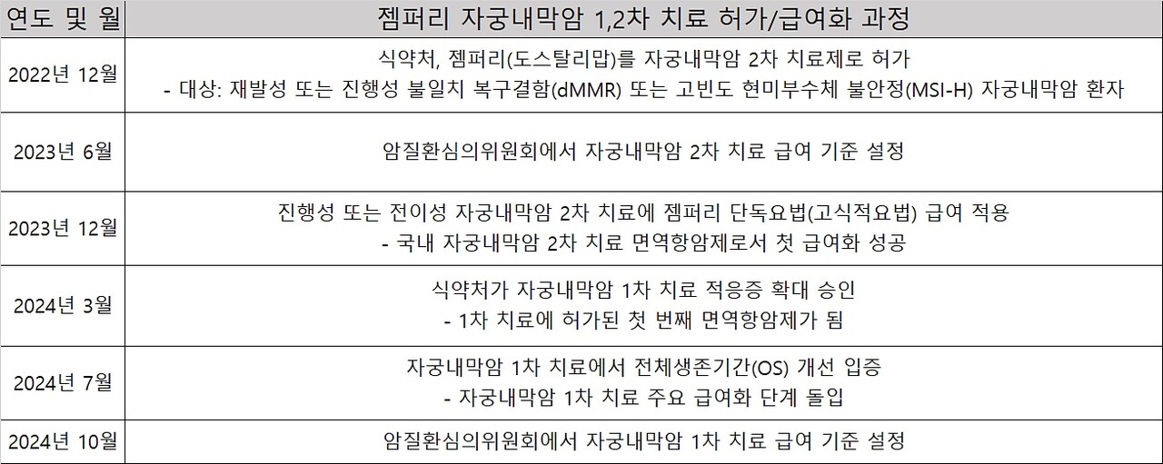 기존 세포독성암 항암화학요법으로는 생존율 개선에 한계가 있었지만, 젬퍼리가 빠른 허가와 급여화가 추진되면서 자궁내막암 치료의 한계를 넘어설 것이 기대된다. 젬퍼리가 매우 빠르게 급여화 단계를 밟을 수 있었던 것은 장기 지속 효과와 부작용이 적다는 면역항암제 강점을 임상 결과와 환자 수요로 입증했기 때문에 가능했다.