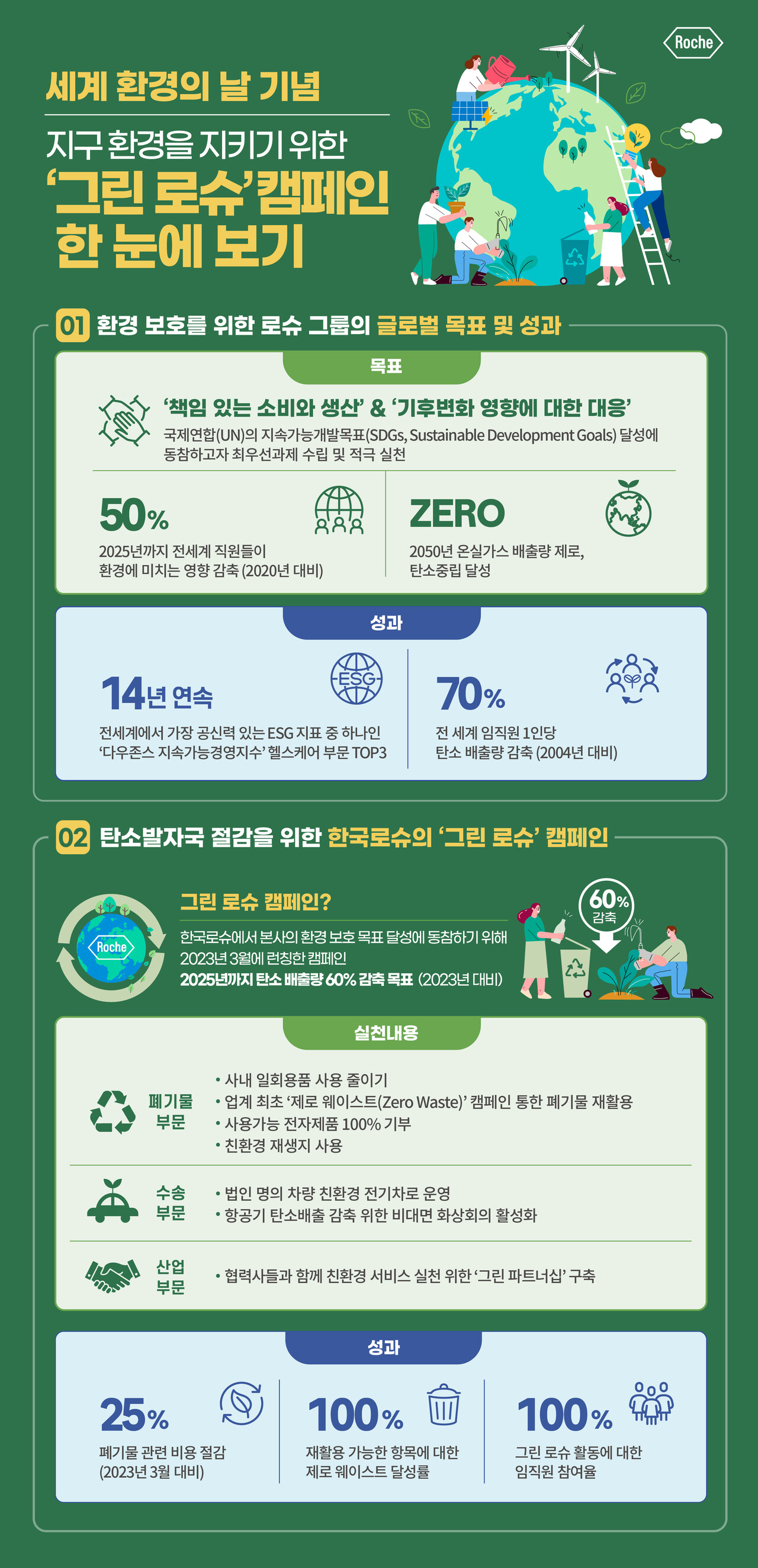 한국로슈 역시 본사 환경 보호 방침에 동참하기 위해 오는 2025년까지 기업 탄소배출량 60% 감축 목표를 내세운 '그린로슈' 캠페인을 지난해 출범했다. 본사 탄소 중립 기준에 맞춰 사내 친환경 규정을 마련하고 ▲자원 재활용을 통한 환경 보호와 폐기물 감축 ▲온실가스 감축을 통한 기후 위기 극복 ▲친환경 그린 파트너쉽 구축 등 다양한 프로그램을 하고 있다.