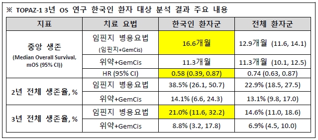 최근 TOPAZ-1 3년 전체 생존율(OS) 추적 데이터가 공개됐고 뒤이어 한국인 하위 분석 데이터까지 발표됐다. 한국인 하위 분석에서 임핀지 병용요법(이하 임핀지+젬시스 병용)으로 치료한 한국인 환자에서 중앙 생존기간(mOS) 16.6개월로 전체 환자군(12.9개월) 대비 매우 고무적인 생존 혜택을 확인했다. 면역항암제 1차 처방을 뒷받침하는 강력한 근거다.
