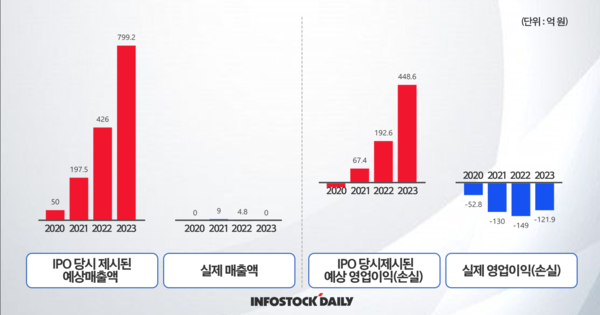 백신 개발 업체 셀리드는 IPO 때 제시한 2023년 추정 매출치는 800억원에 달했다. 하지만 실제 기록한 매출은 ‘0’다. IPO 후 주가는 끝 모르게 하락하는 터라 결국 주주의 피해만 키우고 있다는 지적이다.