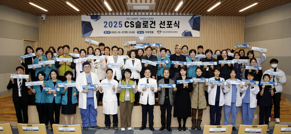 강동경희대학교병원(원장 이우인)이 지난 7일(화) 별관 강당 차우영홀에서 “‘HI! LIGHT HIGH CARE’ 최상의 진료는 밝은 인사로부터”라는 타이틀로 2025 고객감동 슬로건을 선포했다. 병원은 고객 감동의 출발점이 ‘밝은 인사’에서 시작된다고 강조하며, 이를 뒷받침하는 4가지 실천 다짐을 함께 공표했다.