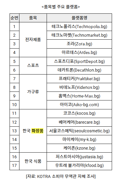 KOTRA 불가리아 소피아무역관은 “불가리아에서 인기 있는 한국 제품은 소비재로, 화장품과 식품류가 중심으로 화장품은 대부분 온라인을 통해 판매되고 있다”라면서 “장기적인 시장 점유율 확대를 목표로 한다면 대형 유통망 입점 경험이 있는 바이어를 발굴하는 것이 좋으며 신뢰를 쌓고 본사 차원의 마케팅 지원을 통한 적극적인 고객 홍보가 중요하다”고 조언했다.
