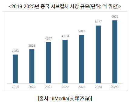 아이미디어 컨설팅(iiMedia) 자료에 따르면, 중국의 서브컬처 관련 시장 규모는 2019년 약 2983억 위안에서 2024년 5977억 위안으로 증가했다. 2029년에는 8344억 위안까지 성장할 것으로 전망될 만큼 매년 큰 폭으로 시장이 확대되고 있다.