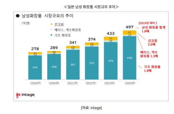 일본 남성 화장품 시장도 꾸준히 성장하고 있다. 2024년 일본 남성 화장품 시장 규모는 497억 엔으로, 전년 대비 무려 114.8%나 성장한 것으로 확인됐다. 전체 매출 중 기초 화장품이 438억 엔(2019년 대비 1.8배 성장), 선크림 42억 엔(2배), 베이스, 색조 등 메이크업 화장품이 17억 엔(1.3배)을 기록하면서 남성 화장품에 대한 수요가 전반적으로 증가한 바 있다.