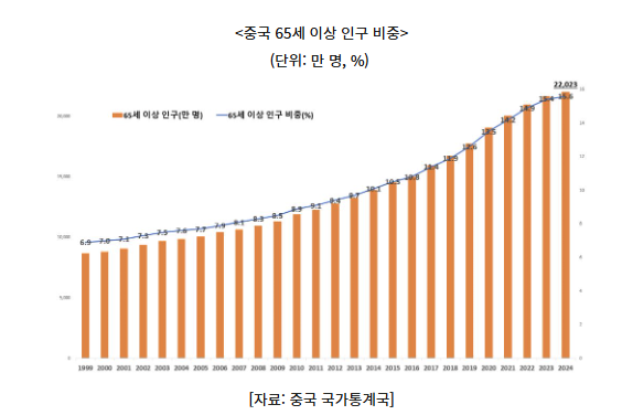 [팜뉴스=김태일 기자] 세계 인구 대국인 중국은 노인 인구도 세계에서 가장 많은 국가다. 중국 국가통계국에 따르면 2024년 말 기준, 중국 내 65세 이상 고령인구는 2억 2,023만 명으로 전체 중국 인구의 15.6%를 차지한다. 중국의 고령화 속도는 상대적으로 빠르게 진행되고 있다. 중국은 2000년 65세 이상 인구 비중 7.0%로 고령화 사회에 진입했으며, 2021년 14.2%의 비중으로 고령 사회에 진입하기까지 21년의 시간이 걸렸다. 미국(72년), 영국(46년), 독일(40년), 프랑스(125년), 일본(24년) 등 선진국에 비해 빠른 속도로 고령화되고 있는 셈이다.