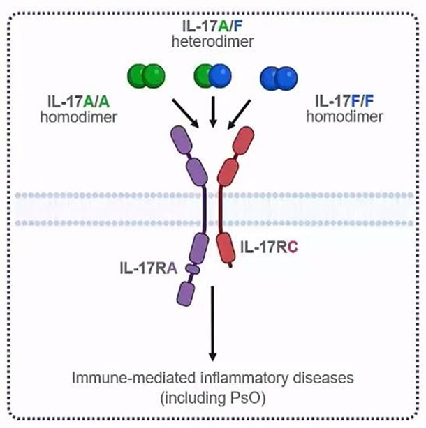 만성 자가면역 매개질환에서 IL-17A, IL-17F 두 사이토카인의 농도 상승은 판상 건선을 포함한 여러 면역 매개 염증성 질환 발병과 관련된다.