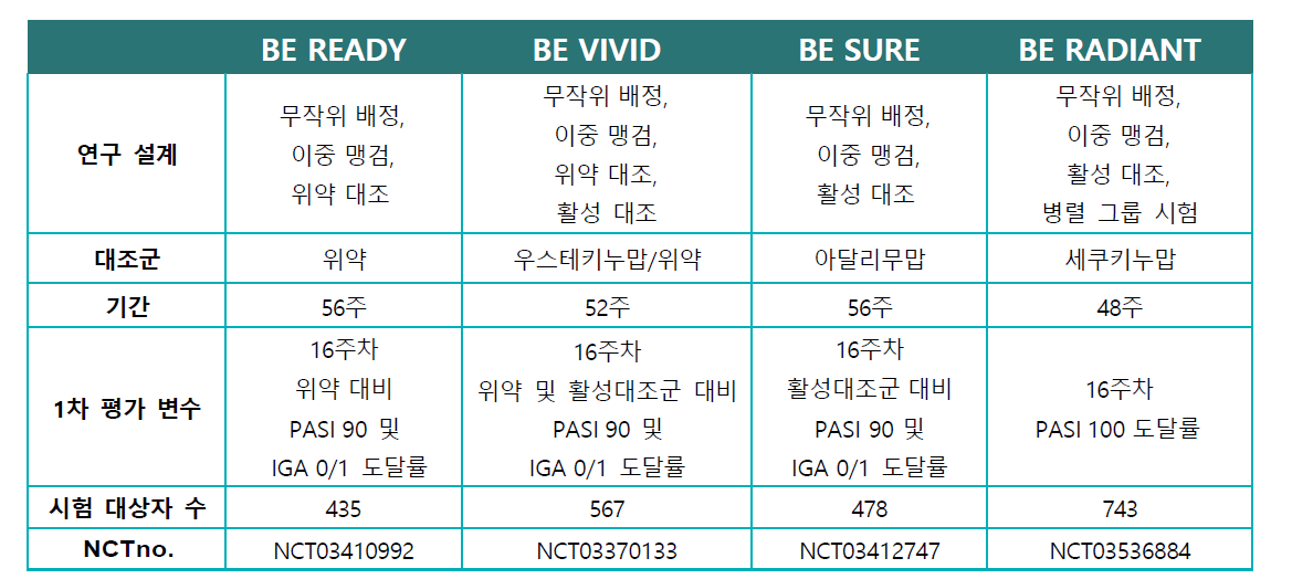 특히 BE SURE, BE VIVID, BE READY, BE RADIANT임상시험에 참여한 환자 중 생물의약품 치료 경험이 없거나, 기존에 1개 또는 2개 생물의약품을 사용한 환자 모두 일관된 PASI 90 반응률까지 확인했다.