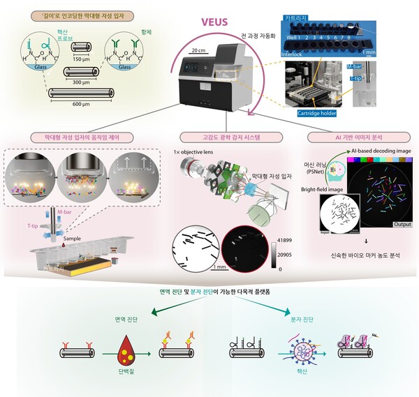 이에 고려대 의대 최낙원 교수 연구팀은 이러한 의료 현장의 요구를 충족하는 차세대 진단 플랫폼 VEUS를 개발했다. VEUS는 전 과정 자동화, 고감도 광학 감지 시스템, AI 기반 이미지 분석, 특정 바이오마커 타겟별 식별 코드를 ‘길이’로 인코딩한 막대형 자성 입자를 통합하여 높은 정밀도를 갖추면서도 면역 및 분자진단이 모두 가능한 다중 진단 기능을 동시에 제공한다. 또한, 진단 성능 평가와 임상 연구를 통해 외상성 뇌 손상(TBI), 패혈증, 호흡기 바이러스 감염(독감, 코로나19) 등 다양한 질환을 1시간 이내로 신속하고 정확하게 진단할 수 있음을 증명했다.