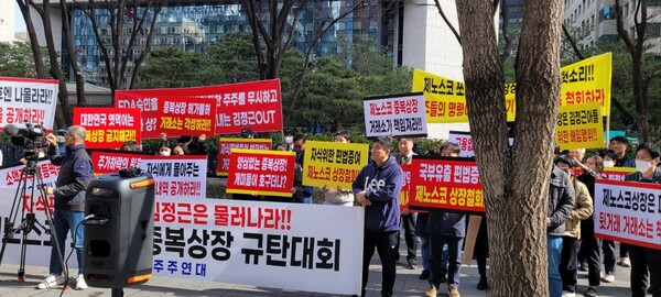 [팜뉴스=김태일 기자] 오스코텍 미국 자회사 제노스코가 코스닥 상장을 추진하면서 주주연대의 반발이 거세지고 있다. 주주연대는 지난 3월 13일 제노스코의 동일 업종, 동일 아이템 중복 상장 저지 및 오스코텍 김정근 대표의 퇴진을 요구하며 여의도 한국거래소 및 금융감독원 앞에서 제3차 규탄대회를 열었다.
