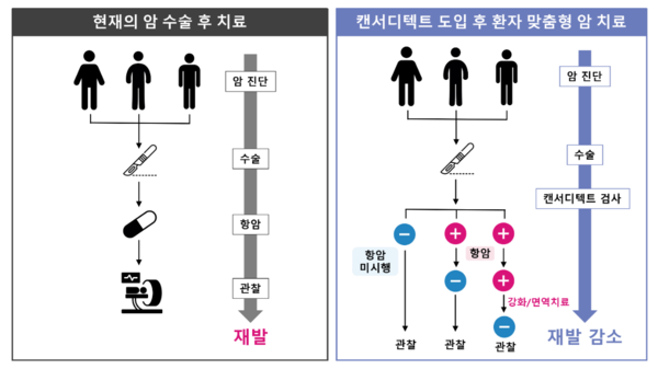 캔서디텍트는 암 수술 후 미세잔존암을 탐지하는 제품으로써 기존 영상 검사보다 최대 20개월 이상 조기에 암의 재발 여부를 확인할 수 있어, 재발위험도에 따른 치료전략을 수립하고 환자의 생존율을 개선하는 데 기여할 수 있다. 특히, 개별 환자에게 특이적으로 나타나는 암 세포의 고유 유전자 돌연변이를 탐지할 수 있는 기술이 적용되어 0.001%의 극미세 변이까지 검출 가능한 세계 최고 수준의 정확도를 갖췄다.