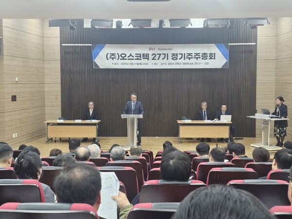 [팜뉴스=김태일 기자] 오스코텍 김정근 대표가 재선임에 실패했다. 재선임이 찬성 22.24% 반대 40.52%로 부결됐다.
