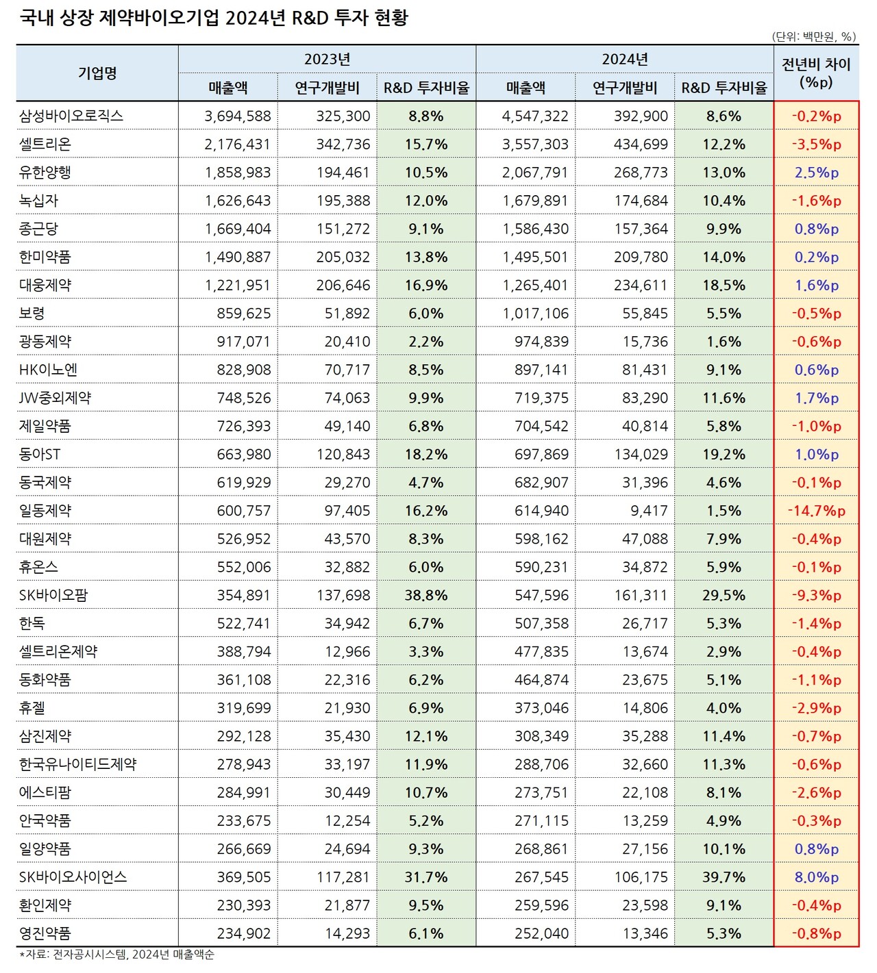 # 1000억원 이상 R&D 투자 제약사 10곳…셀트리온·삼바·유한 순