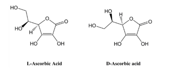 L-ascorbic acid와 D-ascorbic acid는 화학식은 같지만 입체구조가 다른 거울상 이성질체(enantiomer)인 광학 이성질체(optical isomers)이다. 자연계에서 비타민 C는 L-형으로 존재하며, 이 L-형만이 생리 활성형이다. 반면 D-형은 합성이 가능하지만 활성이 거의 없어, 시판되는 합성 비타민 C 보충제는 대부분 L-ascorbic acid 또는 그 염이다. 이 L-ascorbic acid만이 사람을 포함한 동물의 생체 내 반응에 기능한다.