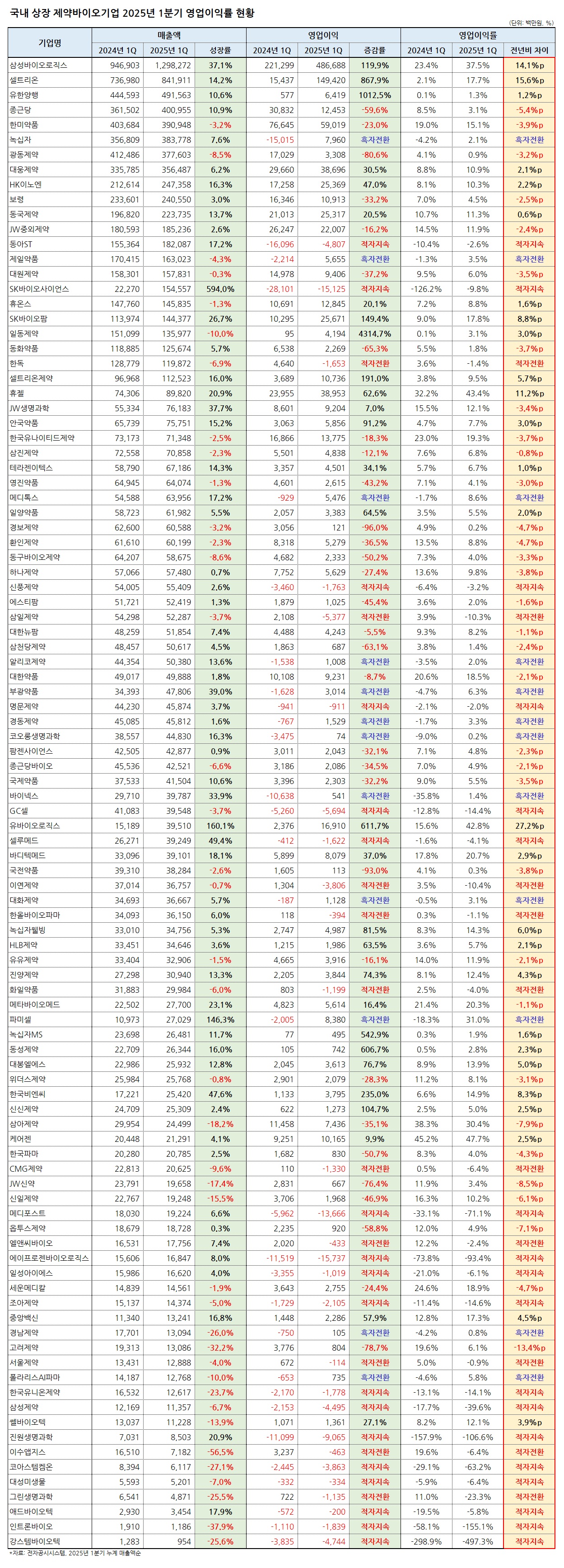 이외에도 유바이오로직스(2025년 1분기 영업이익률 42.8%), 삼성바이오로직스(37.5%), 파미셀(31.0%), 삼아제약(30.4%), 바디텍메드(20.7%), 메타바이오메드(20.3%), 한국유나이티드제약(19.3%), 세운메디칼(18.9%), 대한약품(18.5%), SK바이오팜(17.8%), 셀트리온(17.7%), 중앙백신(17.3%), 한미약품(15.1%), 한국비엔씨(14.9%), 녹십자웰빙(14.3%) 등의 기업이 두자릿대의 영업이익률을 기록한 것으로 집계됐다.