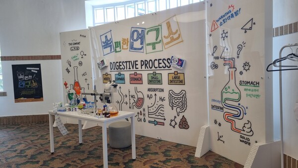 메인 공간인 행사장 2층에 들어서면 가장 먼저 포토 스팟인 '속 편한 연구소'가 눈에 띄었다. 벽면에는 소화 과정을 재치 있게 풀어 낸 그림들, 탁자에는 의약품을 제조·연구하는 다양한 도구들이 전시돼 있었다.