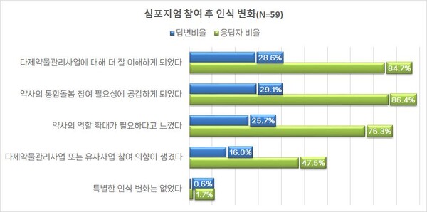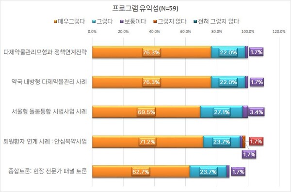 심포지엄에서 발제한 4개 주제에 대해서 매우 유익했다는 평가를 받았다. 각 발제의 유익성 질문에 다제약물관리 모형별 현황과 과제(장선미 가천대 약대 교수)와 약국 내방형 다제약물관리 사례(박태균 중랑구 동삼약국 대표약사)가 각각 98.3%의 만족도를 나타냈다.