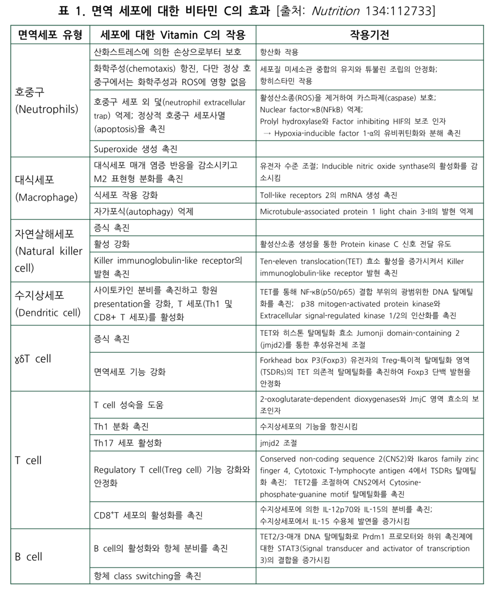 연구자들은 식세포와 자연살해세포, 수지상세포, γδ T 세포, 림프구 등의 면역 세포와 면역 신호 전달에 대한 비타민 C의 효과와 그 기전을 아래 표와 같이 요약했다. 어려운 내용이어서 전문가가 아니면 이해하기 어렵겠지만 근거를 제시하기 위해 정리하였다.