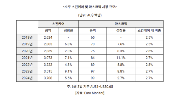 [팜뉴스=김태일 기자] 호주 스킨케어 시장은 2023년 전년 대비 약 9.1%의 높은 성장률을 기록하며 정점을 찍었다. 그러나 2024년 들어 성장세가 5.5%로 둔화되면서, 전체 시장은 안정기에 접어드는 흐름을 보이고 있다.
