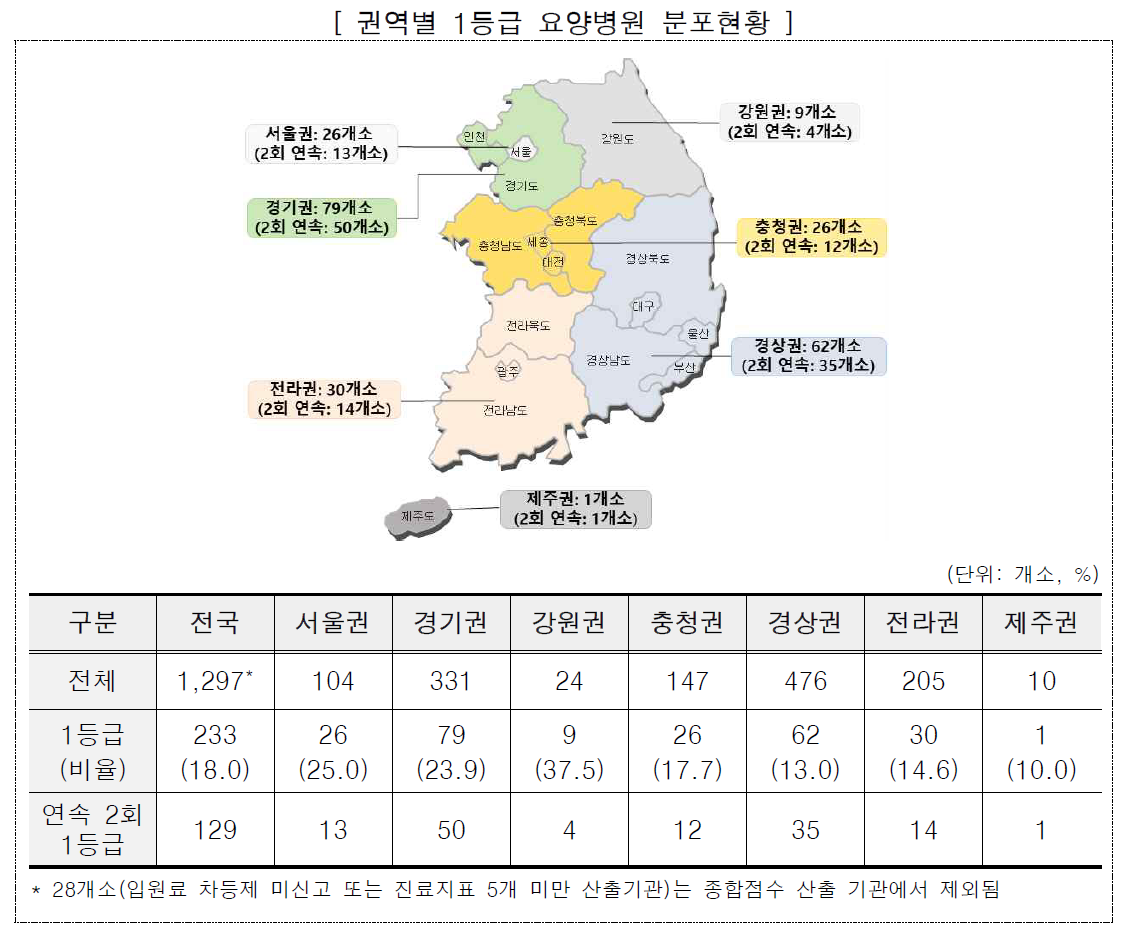[팜뉴스=김민건 기자] 2023년 우수 요양병원 평가에서 1등급 평가를 받은 곳은 총 223곳으로 이 가운데 129곳이 2회 연속 1등급을 받았다. 권역별로는 경기권, 경상권, 전라권 순으로 많았다.