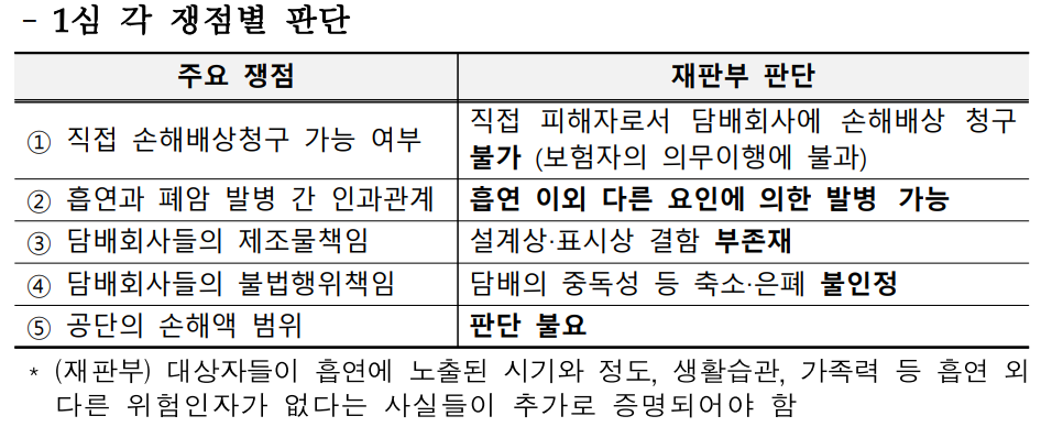 특히, 국내에서도 흡연이 폐암 등 질병에 직접적인 원인이 될 수 있다는 법적 인식 확산에 기여한 것으로 보고 국내 법원 해석과 판단에 주요한 참고 기준이 될 것으로 기대한다.