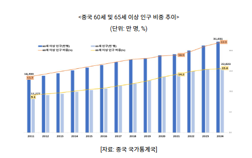 2024년 말 기준으로 중국 내 65세 이상 고령인구는 약 2억 2023만 명, 전체 인구의 15.6%를 차지한다. 같은 해 60세 이상 인구는 3억 1031만 명으로 전체의 22%에 달했다. 고령 인구의 급증은 중국 사회·경제 전반에 걸쳐 실버산업 육성 필요성을 높이고 있다.