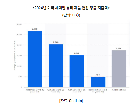 Statista의 2024년 자료에 따르면, 밀레니얼과 Z세대는 타 세대보다 2~5배 많은 뷰티 지출을 기록하며, 전체 스킨케어 시장의 40% 이상을 차지하는 핵심 소비층으로 부상했다.