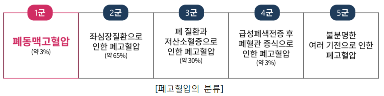 폐고혈압은 1~5군으로 분류하며 폐동맥 고혈압(3%, 1군), 심부전(좌심장 질환 폐고혈압, 65%, 2군), 폐섬유화증(폐 질환과 저산소혈증 폐고혈압, 30%, 3군), 급성폐색전증 후 폐혈관 증식 폐고혈압(3%, 4군), 특발성 폐고혈압(5군)이 있다.