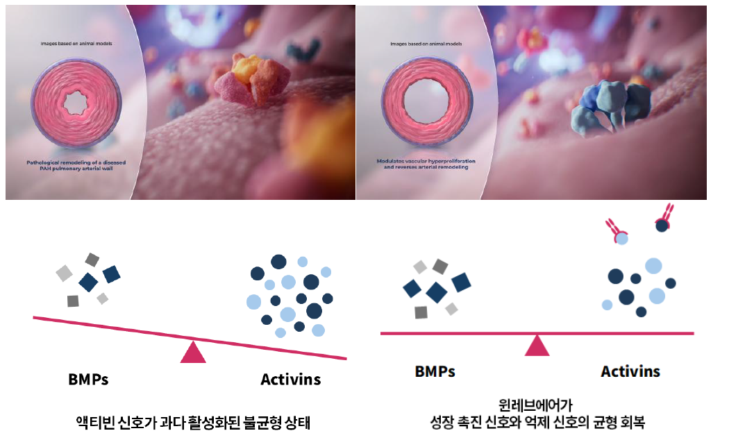 윈레브에어는 액티빈과 TGF-β 계열 단백질에 결합, 성장을 촉진하는 액티빈 신호를 억제하고 액티빈과 골형성단백질 경로 간 균형을 회복한다. 비정상적으로 두꺼워진 혈관 증식을 억제하고 변형된 폐혈관 구조를 개선해 폐고혈압 증상을 완화하는 비결이다.