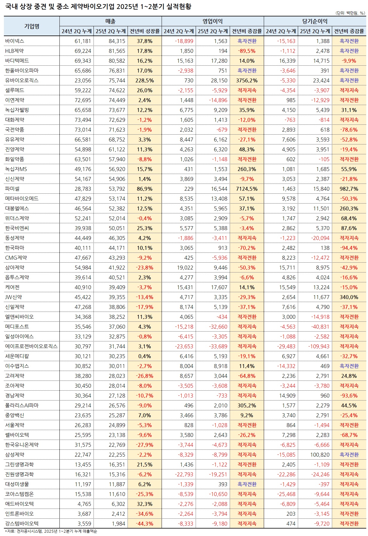 매출이 증가한 기업들 중에서는 유바이오로직스의 실적이 가장 눈에 띄었다. 유바이오로직스의 2025년도 상반기 매출액은 757억원으로 전년 동기(230억원) 대비 228.5%가 성장했고, 영업이익은 7억원에서 281억원에서 3756.2%가 증가했다.
