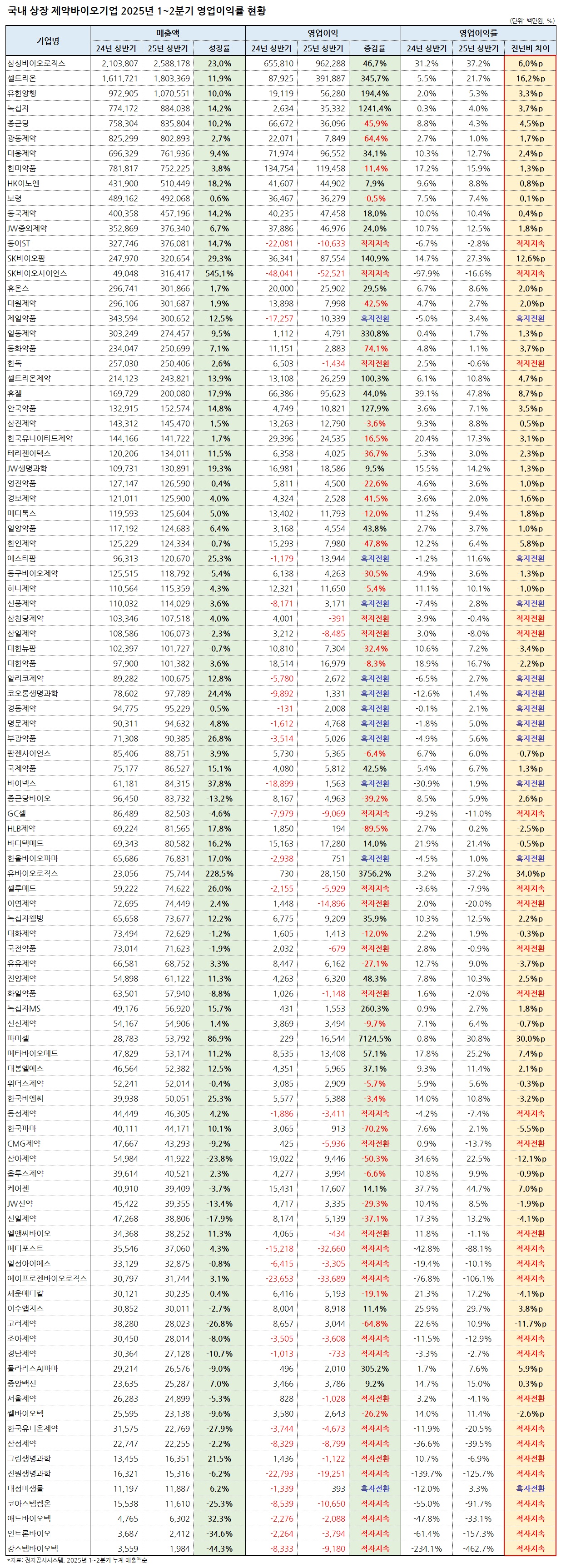 또한 케어젠(2025년 상반기 영업이익률 44.7%), 삼성바이오로직스(37.2%), 유바이오로직스(37.2%), 파미셀(30.8%), 이수앱지스(29.7%), SK바이오팜(27.3%), 메타바이오메드(25.2%), 삼아제약(22.5%), 셀트리온(21.7%) 등의 제약사들이 높은 영업이익률을 기록했다.